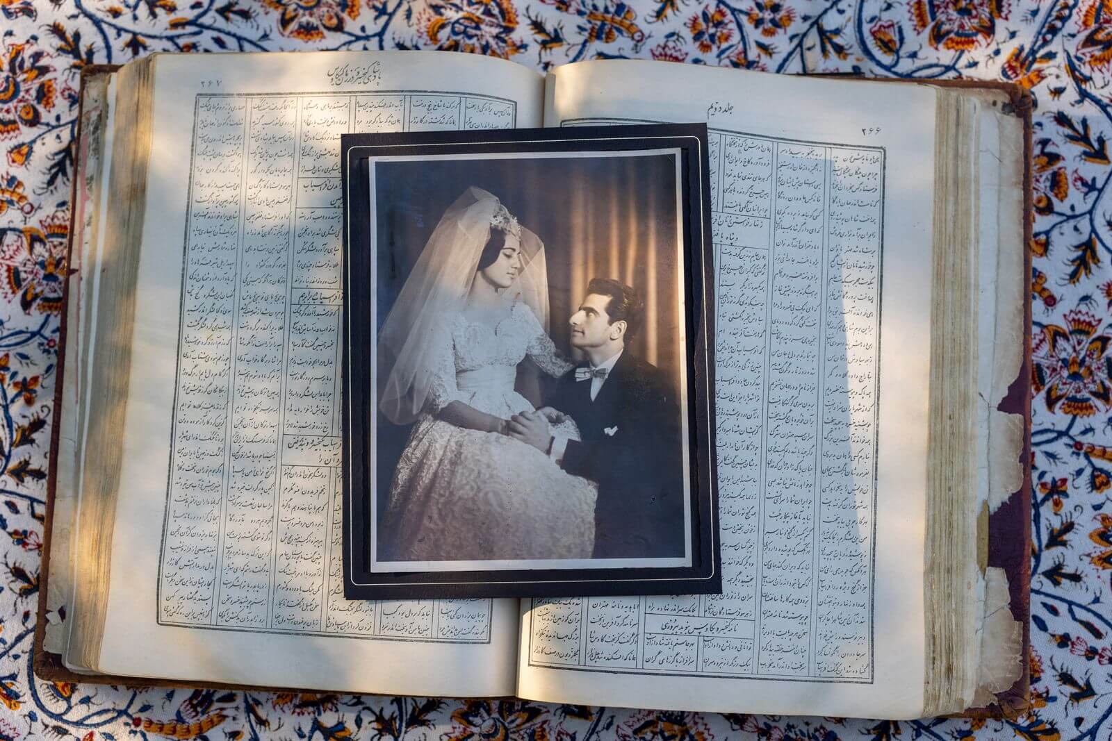 “Mitra loved anything beautiful. She kept countless notebooks. And on every page she’d paste something beautiful: a flower, a feather, a line from a poem. One time we went to a large antique shop, and the owner challenged us to choose the most expensive items in the shop. Mitra looked around the store and chose two that nobody else had noticed. The owner was shocked. He announced that those were the only two that were not for sale. She had a genius for beauty. It was one of her greatest gifts. But her greatest gift by far, was her memory. Mitra could memorize an entire poem after hearing it a single time. Her favorite was Hafez: The Prince of Romance. She’d memorized two hundred of his ghazals. And whenever she found a verse that she loved, she’d bring it to me to read. We’d heard our voices many times before in arguments. But it was different when we read poetry. There was a softness, a delicacy. When you’re reading a poem, you must find the melody. 𝘈𝘩𝘢𝘯𝘨. The instrument is your throat. And the words are the notes. Some you strike suddenly—with a bang. Others you unroll gently, like a bow being slowly pulled across the string of a violin. Every word has life. Every word has its own soul. The word roar has a soul. 𝘒𝘩𝘰𝘳𝘰𝘰𝘴𝘩! And so does the word kiss. 𝘉𝘰𝘰𝘴𝘦𝘩. We were married in the traditional way. It was a small ceremony at the home of Mitra’s father. On the morning of our wedding Mitra and I visited a famous photographer in Tehran. We took a series of photographs standing side-by-side. She was so conscious of her crippled hand, she found a way to hide it in every photo. But she’d never looked so beautiful. When the session was finished, I suggested one final photograph. I could tell the photographer was annoyed, but he agreed. And it’s the photograph that still hangs in our house today. Mitra is sitting on a chair. And I’m down on one knee, looking up at her, holding her hand.”